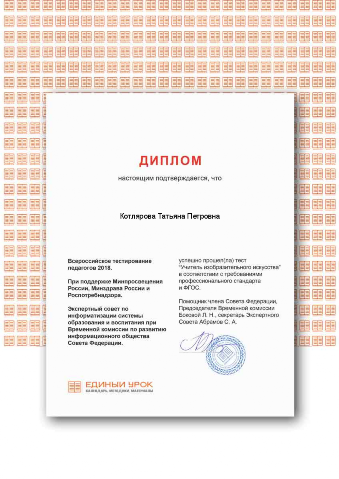 Диплом успешно прошёл тест "Учитель изобразительного искусства в соответствии с требованиями профессионального стандарта и ФГОС" 2018 г.