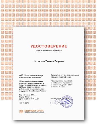 Удостоверение "Коррекционная педагогика и особенности образования детей с ОВЗ" 73 часа 2021г.