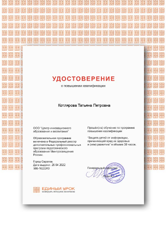 Удостоверение "Основы обеспечения информационной безопасности детей" 36 часов, 2021г.