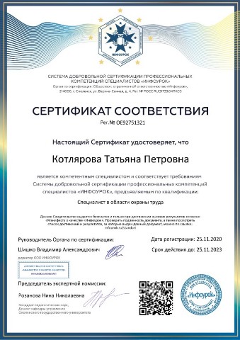 Сертификат соответствия. Специалист в облости охраны труда 2020г.