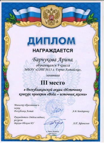 Барчукова Алина 9 класс, 3 место в республиканском конкурсе проектов "Вода-источник жизни" 2015г. |