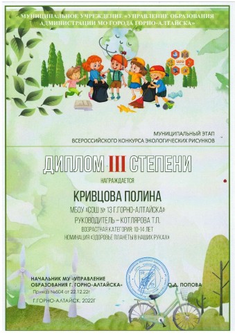 Диплом 3-й степени вручается Кривцовой Полине, номинация "Здоровье планеты в наших руках", 2022г. |