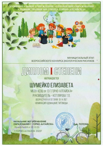 Диплом 1-й степени вручается Шумейко Елизавете, номинация "Домашние питомцы", 2022г. |