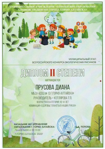 Диплом 2-й степени вручается Прусовой Диане, номинация "Здоровье планеты в наших руках", 2022г. |