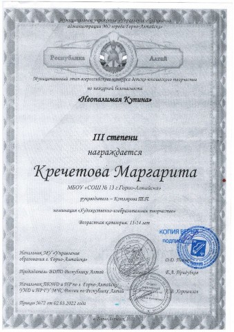 Диплом 3- й степени награждается Кречетова Маргарита, "Неопалимая Купина", 2022 г. |
