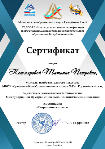 Сертификат за участие в региональном заочном этапе международной Ярмарки социально-педагогических инноваций в наминации "Современная школа" 2022г.