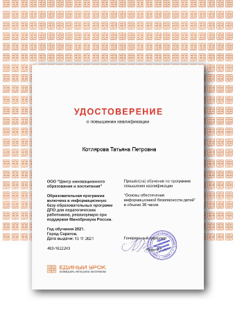 Удостоверение "Основы обеспечения информационной безопасности детей" 36 часов, 2021г.