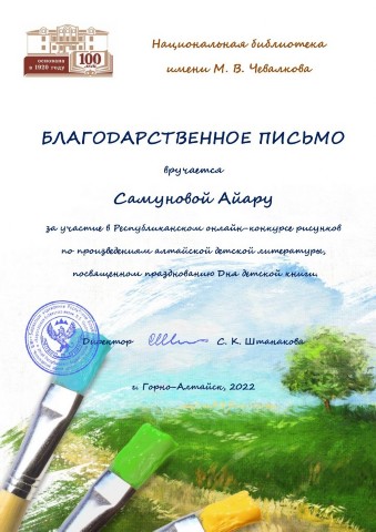 Благодарственное письмо вручается Самуновой Айсару за участие в Республиканском онлайн-конкурсе рисунков по произведениям алтайской детской литературы, посвященном празднованию Дня детской книги. 2022г. |