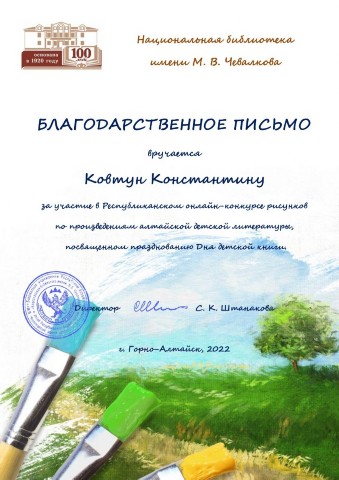 Благодарственное письмо вручается Ковтун Константину за участие в Республиканском онлайн-конкурсе рисунков по произведениям алтайской детской литературы, посвященном празднованию Дня детской книги. 2022г. |