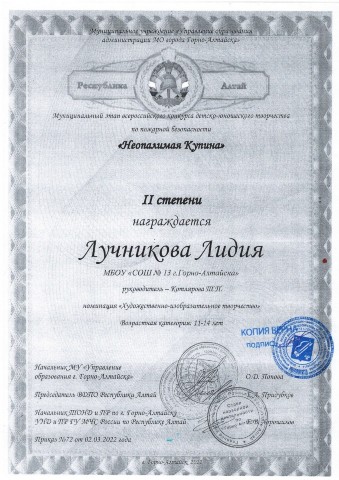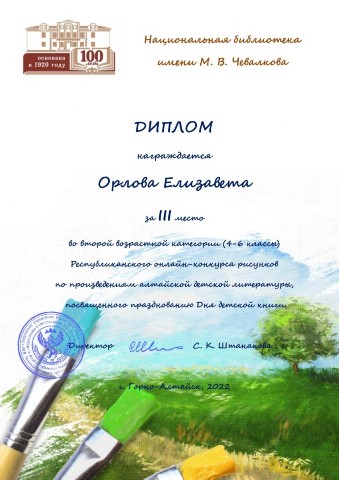 Диплом за 3-е место вручается Орловой Елизавете за участие в Республиканском онлайн-конкурсе рисунков по произведениям алтайской детской литературы, посвященном празднованию Дня детской книги. 2022г. |