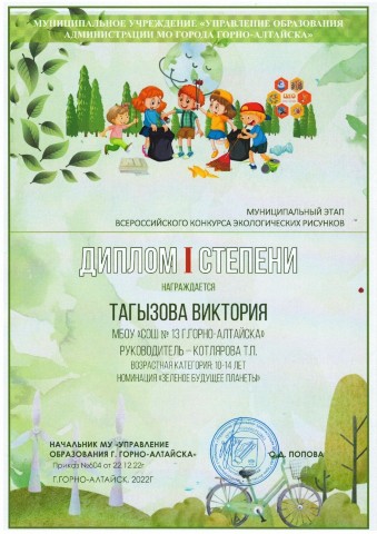 Диплом 1-й степени вручается Тагызовой Виктории, номинация "Зелёное будущее планеты", 2022г. |
