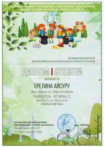 Диплом 1-й степени вручается Ерелиной Айсуру, номинация "Мир воды", 2022г. |
