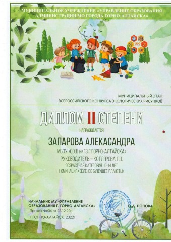 Диплом 2-й степени вручается Запаровой Александре, номинация "Зелёное будущее планеты", 2022г. |